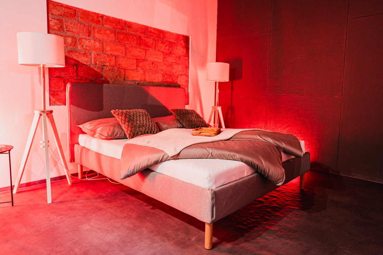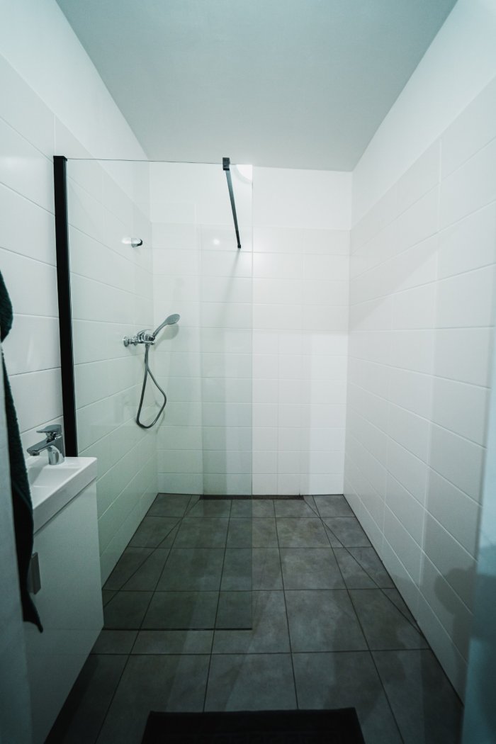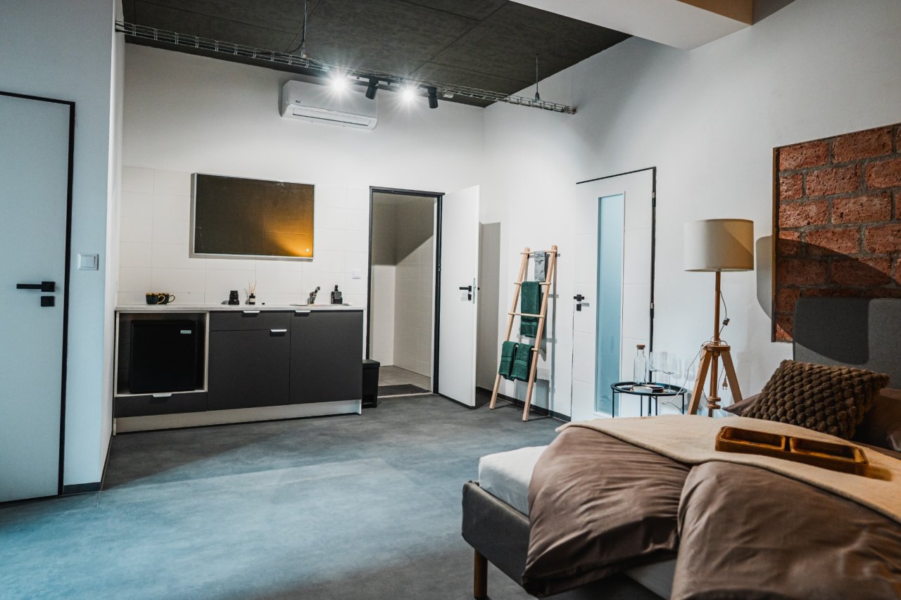 Vstup máte pomocí unikátního kódu, který obdržíte po rezervaci. Uvnitř na vás čeká pohodlné lůžko, velká sprcha, kuchyňka a relax‑zóna. Pokud budete chtít, i diskrétní hravé vybavení připravené