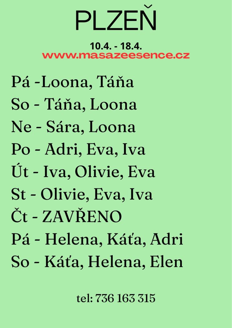 | Čtvrtek | Na dotaz |